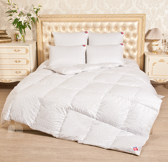Для самых требовательных потребителей, ищущих традиционное исполнение, долговечность и комфорт. Пуховые одеяла из натурального пуходержащего белоснежного тика с мелким рисунком и шелковым кантом цвета шампань по периметру, изящно подчеркивающим форму.